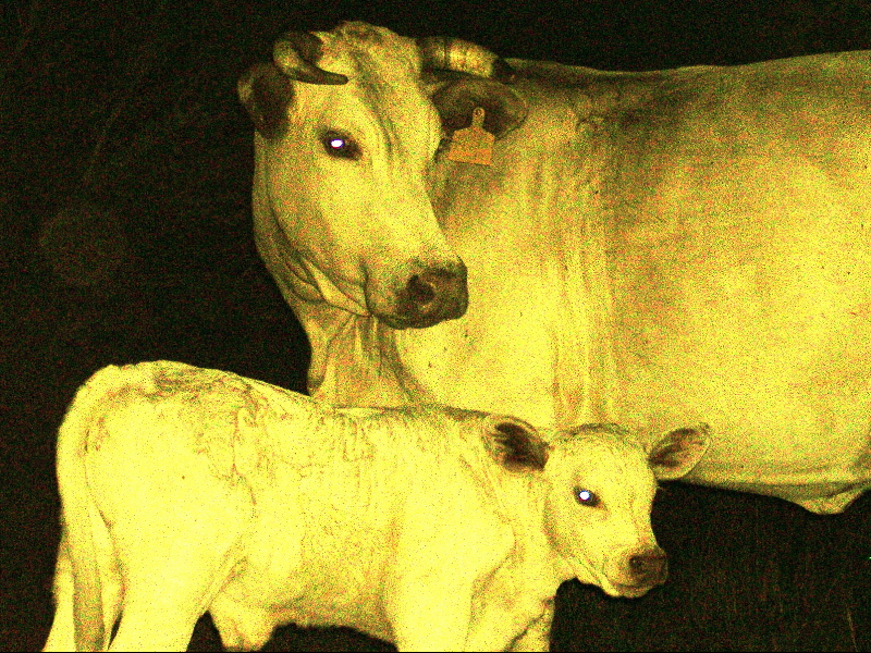 I took this picture of a really young white calf and his mother at night. When I imported it into iPhoto I noticed it was really dark, so I clicked the 'enhance' button, and they turned yellow. Now that's a cow of a different color!