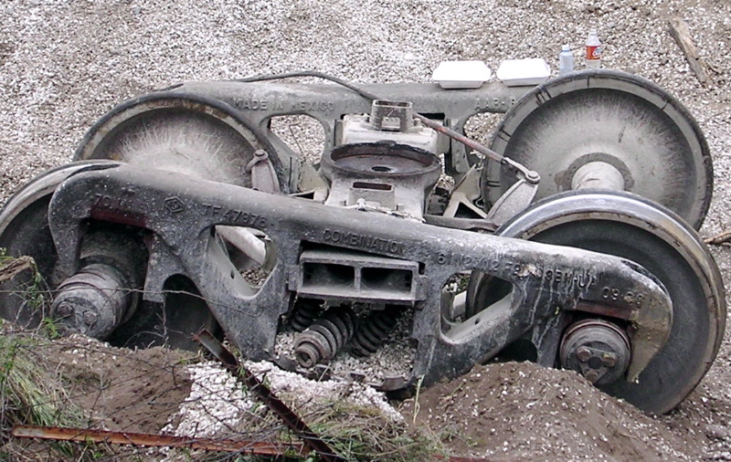 The aftermath of a train wreck. Someone has his take-out lunch sitting on the wheels.